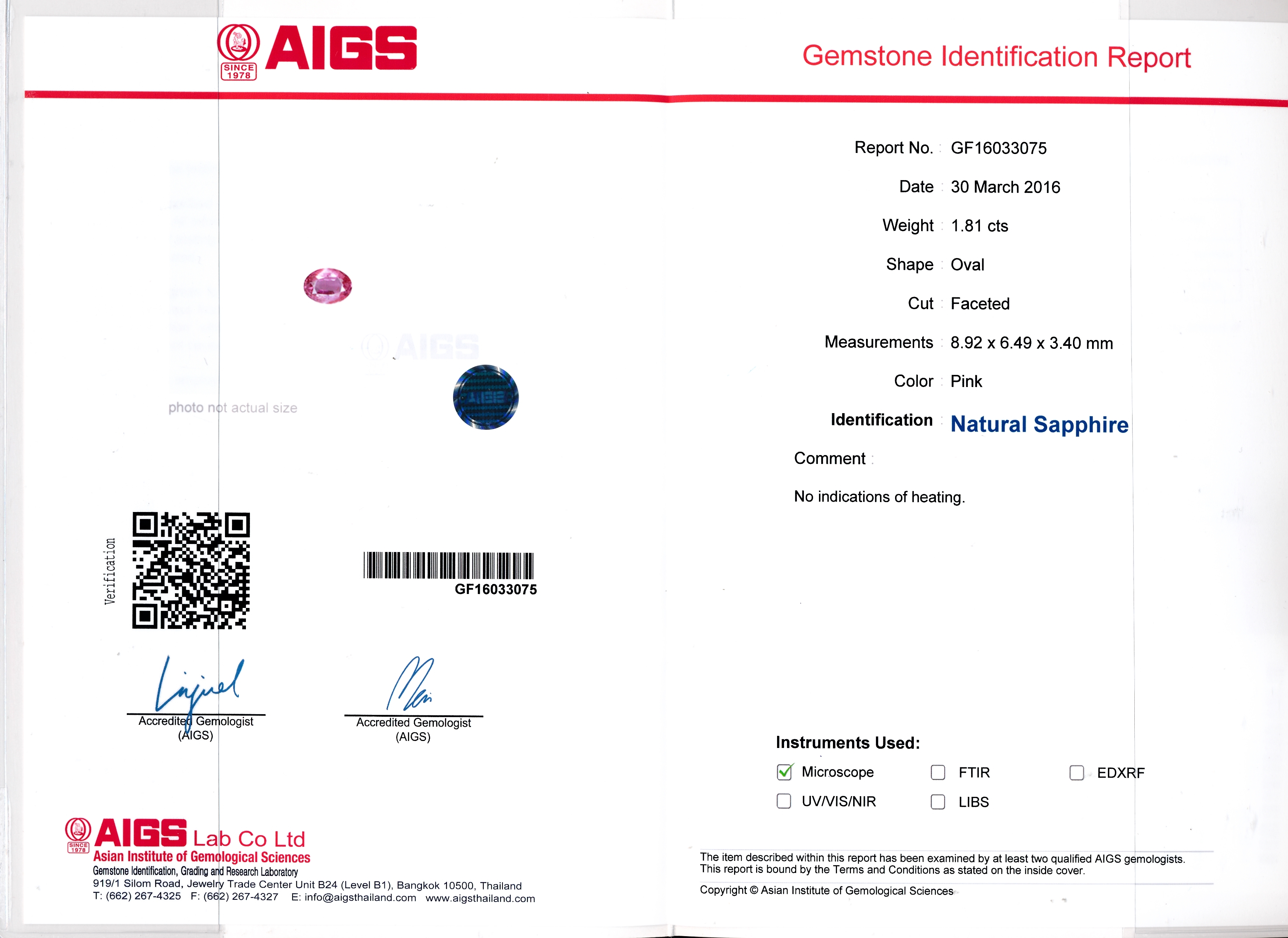 AIGS - Pink Ruby/Sapphire Oval Shape F/C 1.81 cts - No Heat