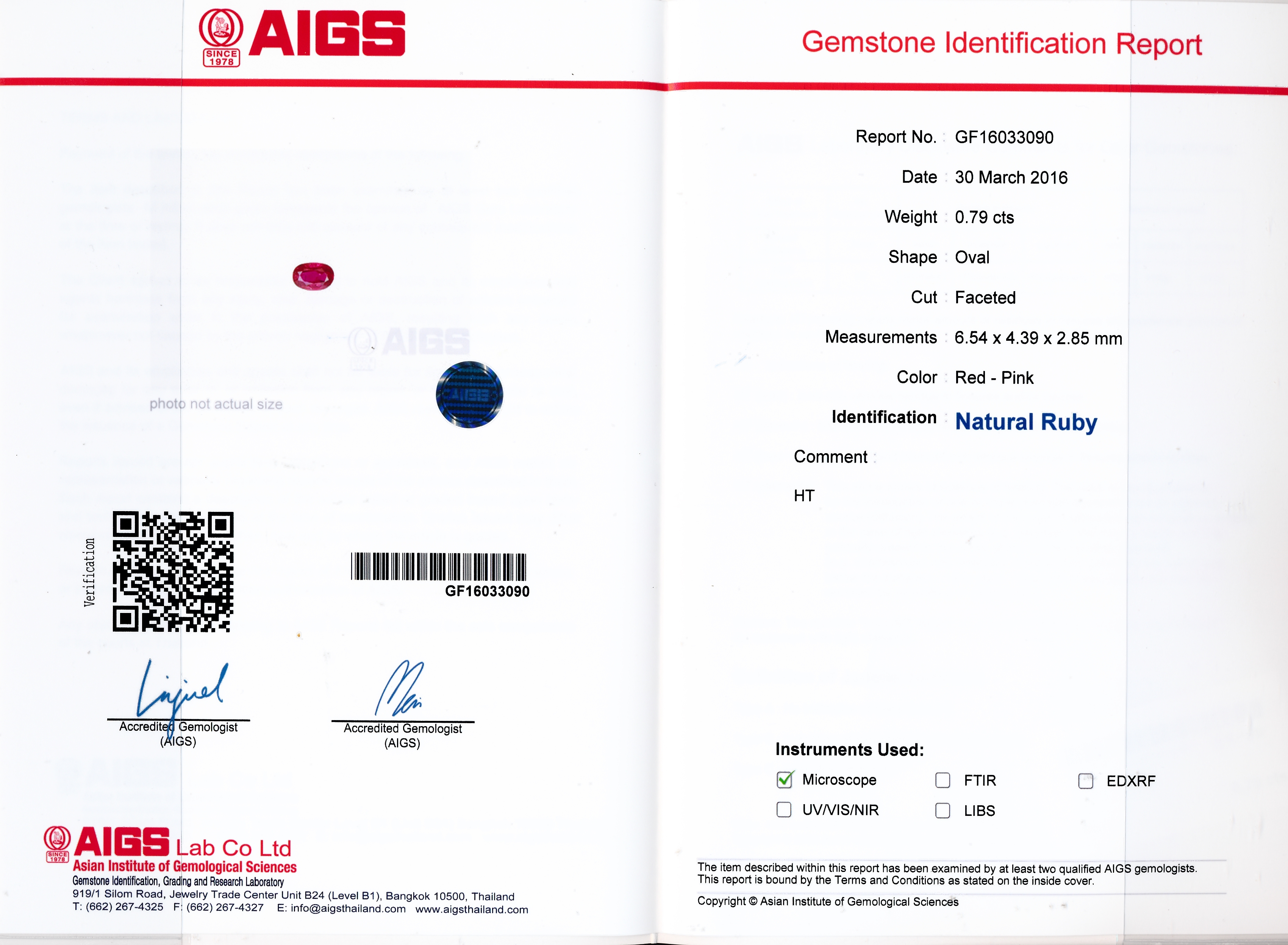 AIGS - Red-Pink Ruby Oval Shape F/C 0.79cts