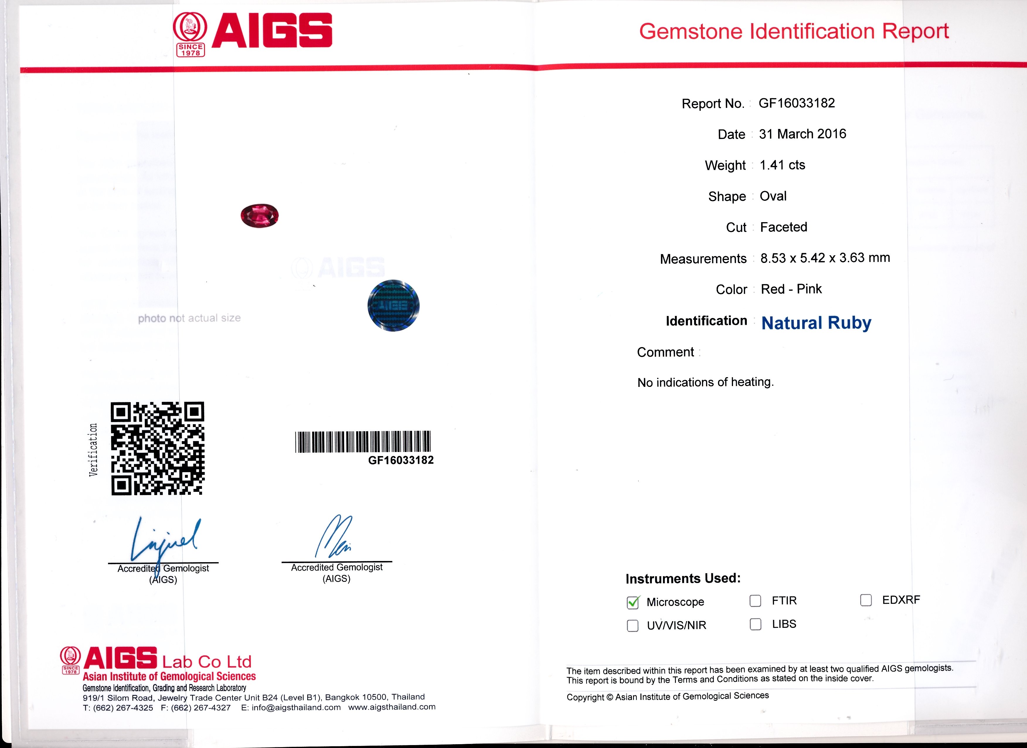 AIGS - Red-Pink Ruby Oval Shape F/C 1.41cts - No Heat