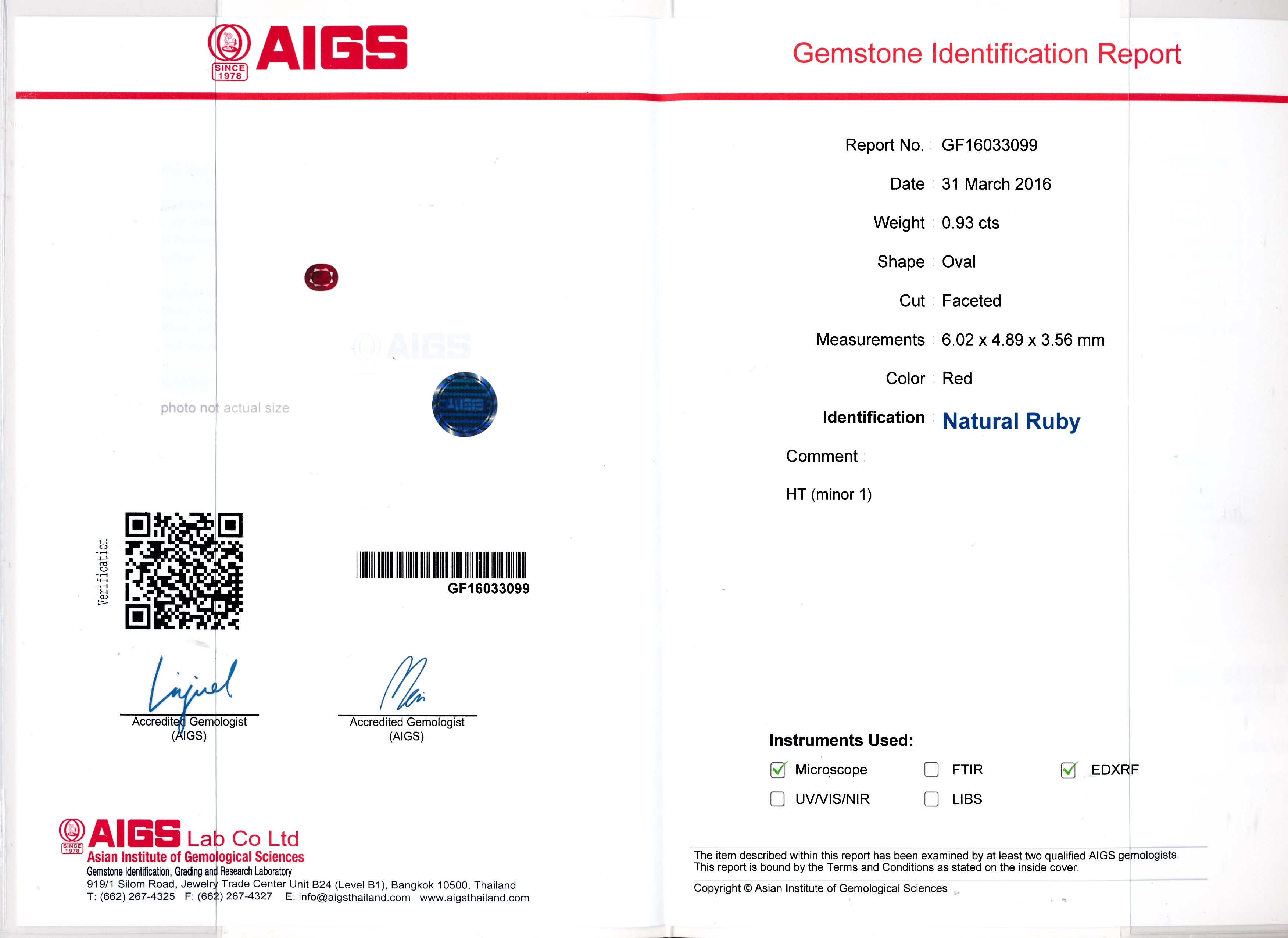 AIGS - Red Ruby Oval Shape F/C 0.93cts