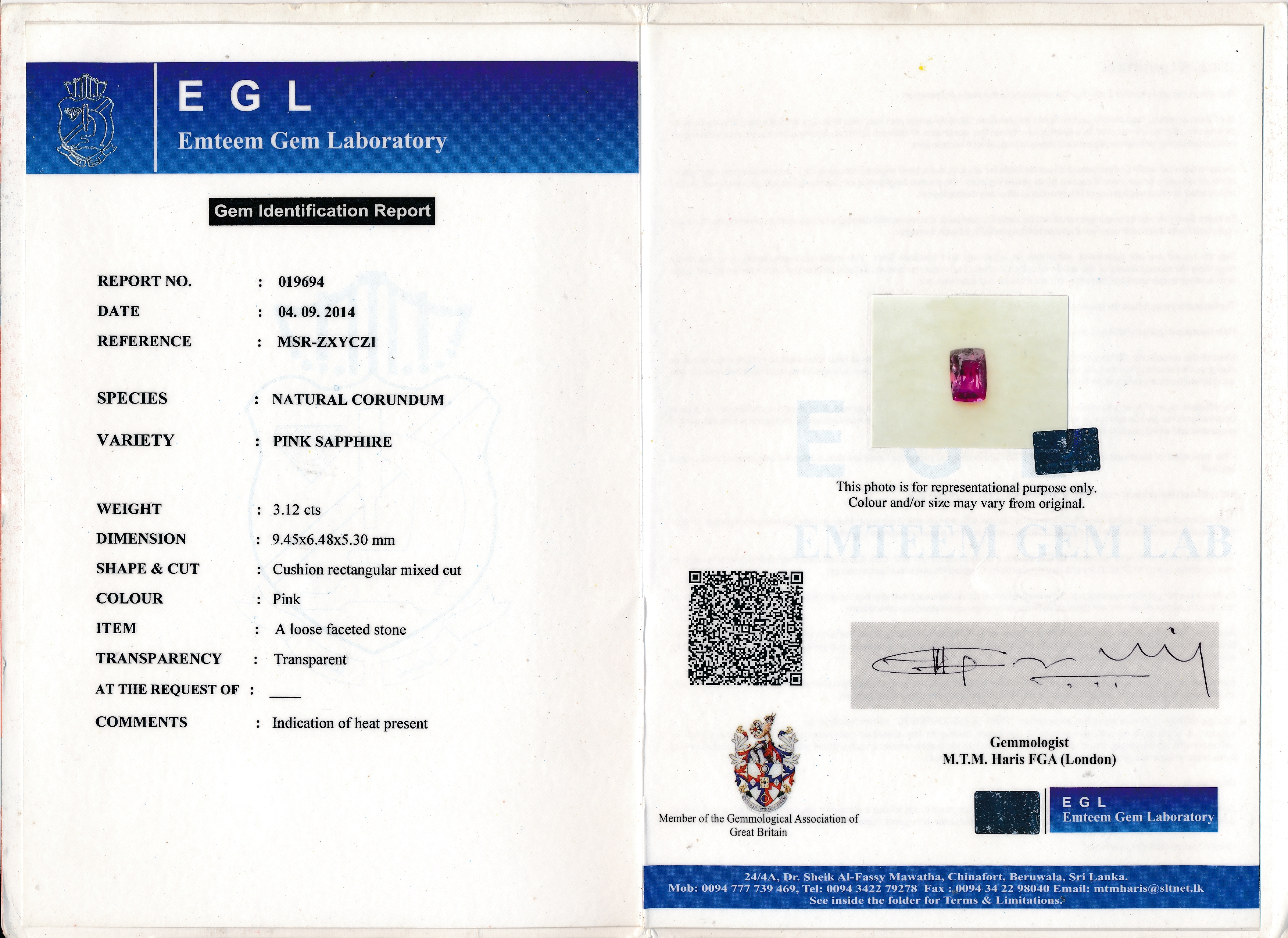 EGL - Ruby/Pink Sapphire Cushion Cut F/C 3.12cts