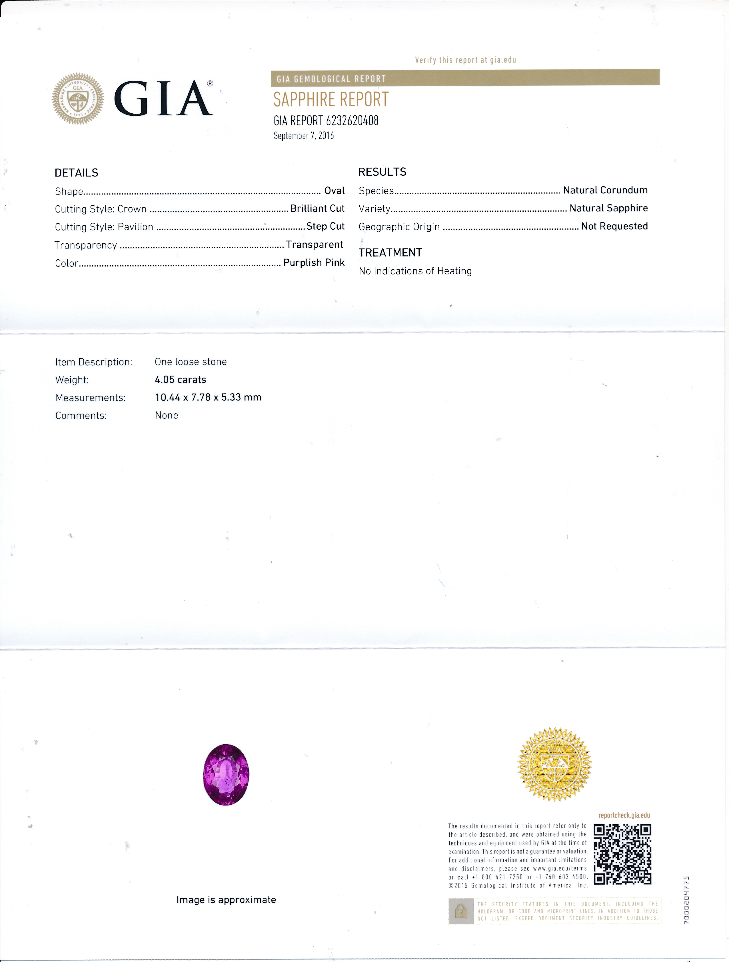 GIA - Purplish Pink Oval Shape Sapphire F/C 4.05cts - NO HEAT