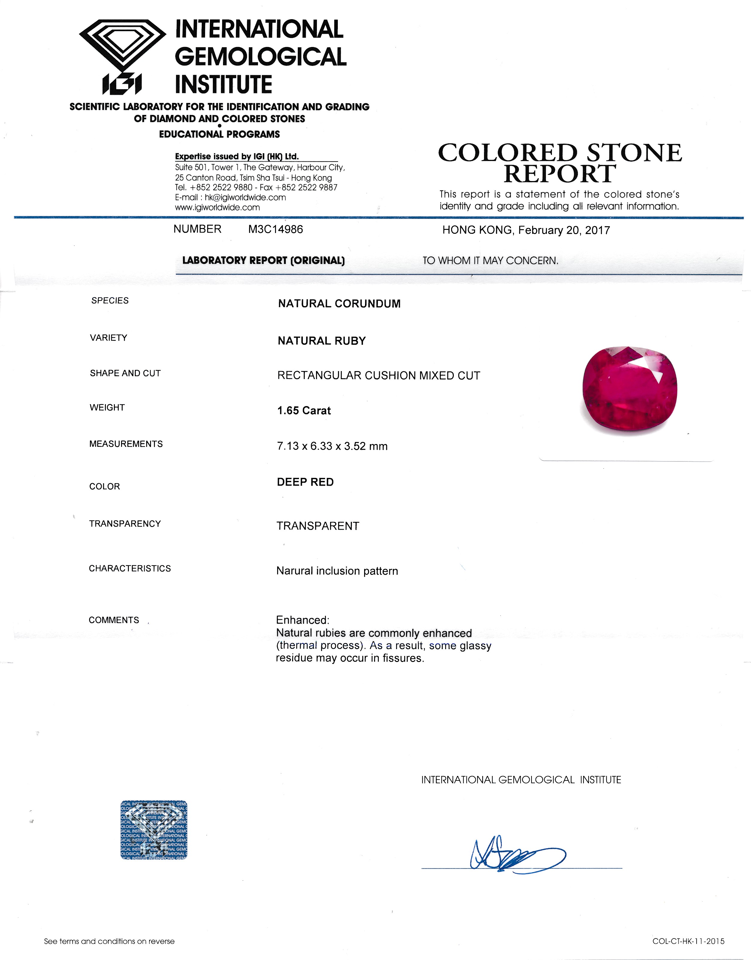 IGI - Deep Red Ruby Cab (Buff Top) Cushion Cut 1.65cts