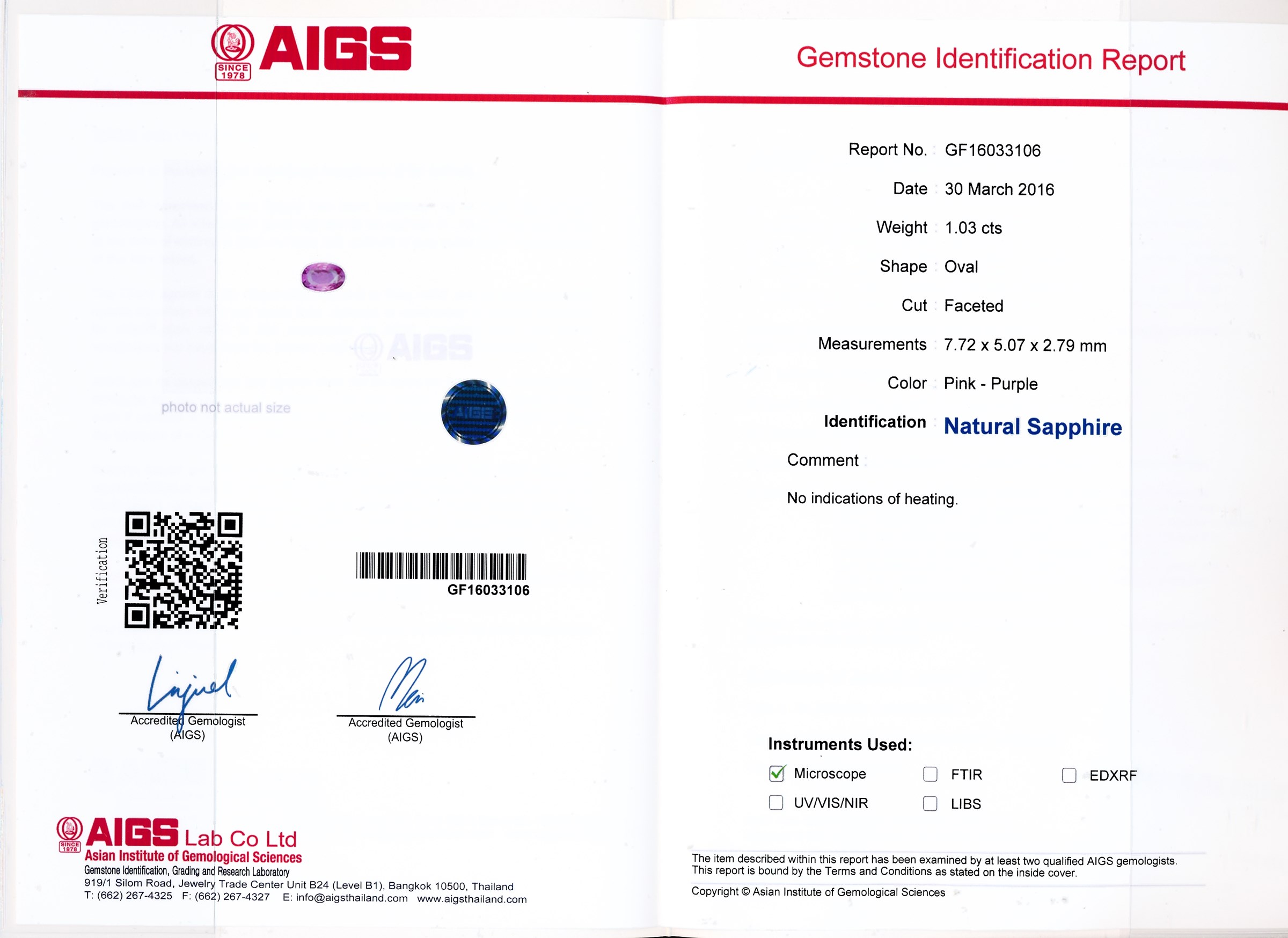 Sapphire Oval Pink-Pur F/C 0.84Cts AIGs cert,GF16033151,No Heat