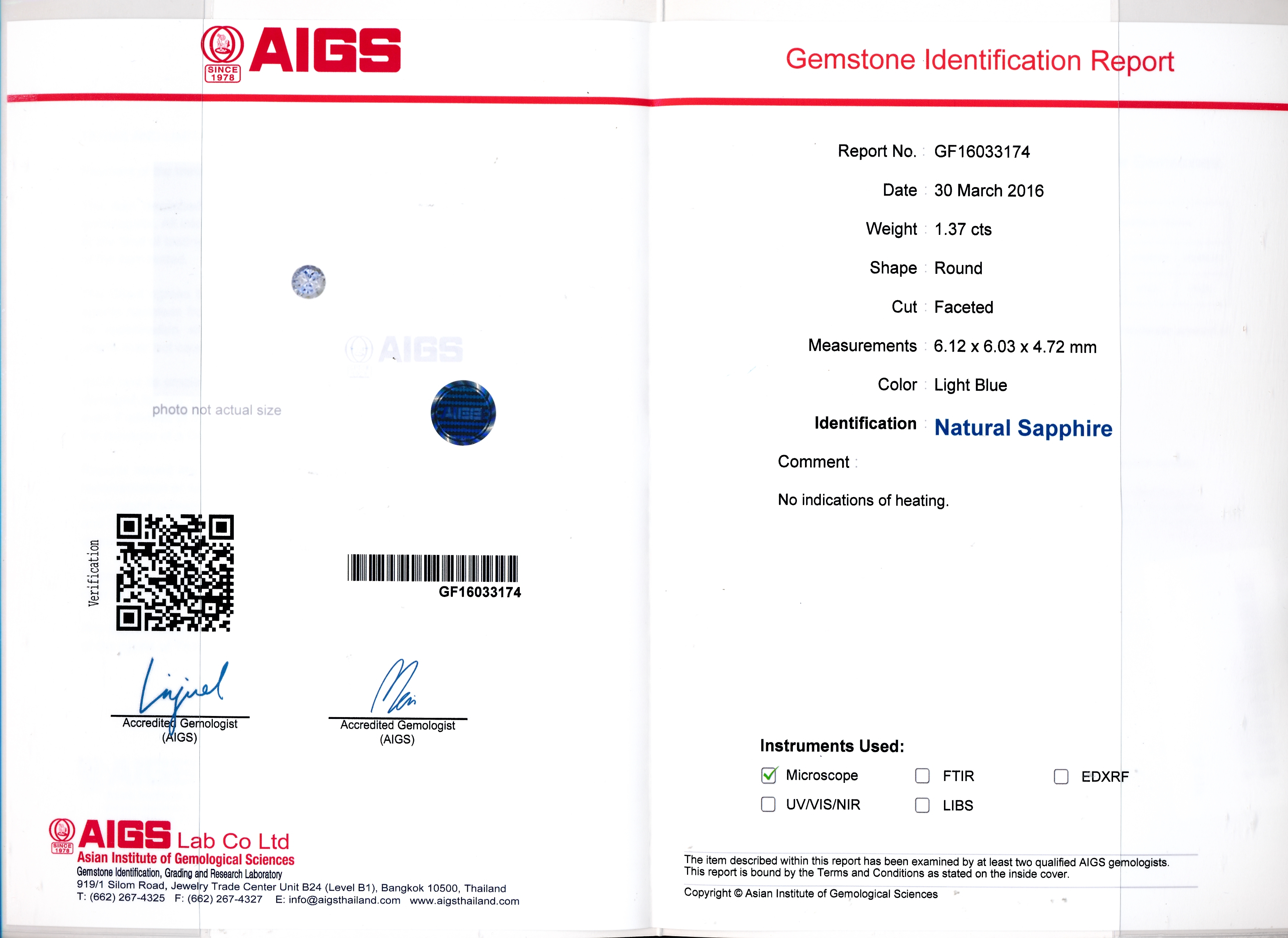 Sapphire Round Lt.Blue F/C 1.37Cts,AIGs certified,GF16033174,NO HEAT